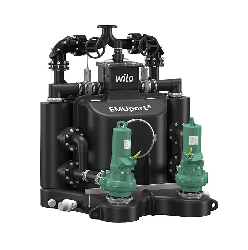 Pumping station with separation of solids, protects pumps from clogging and the formation of wear-resistant substances in waste water, high-speed pumping unit, equipped with IP68 submersible pumps in a dry sump design, backwash tank to prevent sediment in the collection tank. Easily accessible collection tank for cleaning. CS design including self-supporting PE-HD shaft or design for installation in a concrete shaft or building.