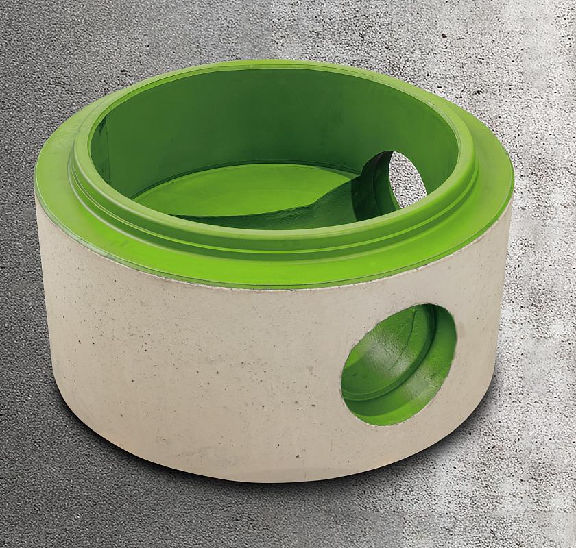 The base chamber with a polyurethane lining using STRATO technology is a construction component for the access shafts, designed for the inspection, maintenance, ventilation, and de-aeration of sewage systems. The plastic liner is specifically manufactured with extreme resistance to chemical and corrosive substances, featuring a perfectly smooth surface that does not hinder the flow of wastewater. Another advantage of the technology is the absence of joints, perfect anchoring of the insert, long lifespan, and high strength compared to fully plastic alternatives.