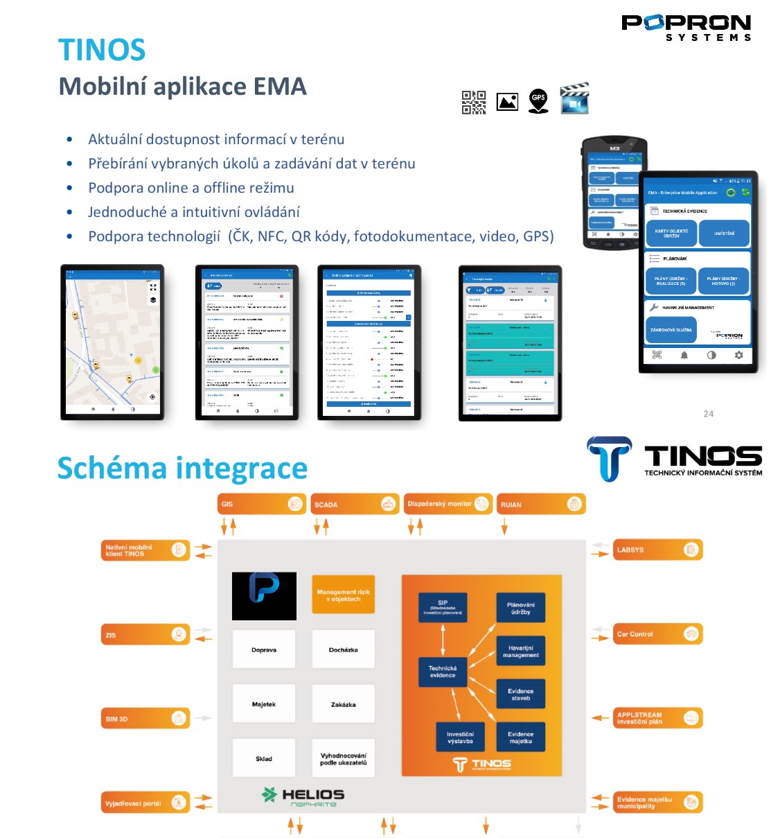 TINOS je technický informační systém (TIS), který je vysoce sofistikovaným, komplexním a v praxi ověřeným řešením, které umožňuje efektivní správu a údržbu vodohospodářské infrastruktury s komunikačním propojením na oborově využívané externí aplikace, zejména GIS, ZIS, LABSYS a SCADA. Mobilní aplikace EMA (Enterprise Mobile Application) je určena pro pohodlnou a rychlou práci v terénu prostřednictvím mobilních zařízení umožňující mít data společnosti neustále k dispozici, například pro řízení servisních techniků, sběru dat či evidenci činností prováděných v rámci servisu, nebo dalších specifických agend.